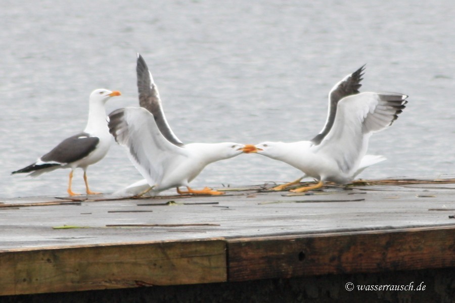 The gulls are having a discussion on the breakwater. One of them has become unemployed. He had worked as a clue on a black bouy south of Lanesborough but this was replaced by a marker. After a fight over a new job the looser walks depressly away.