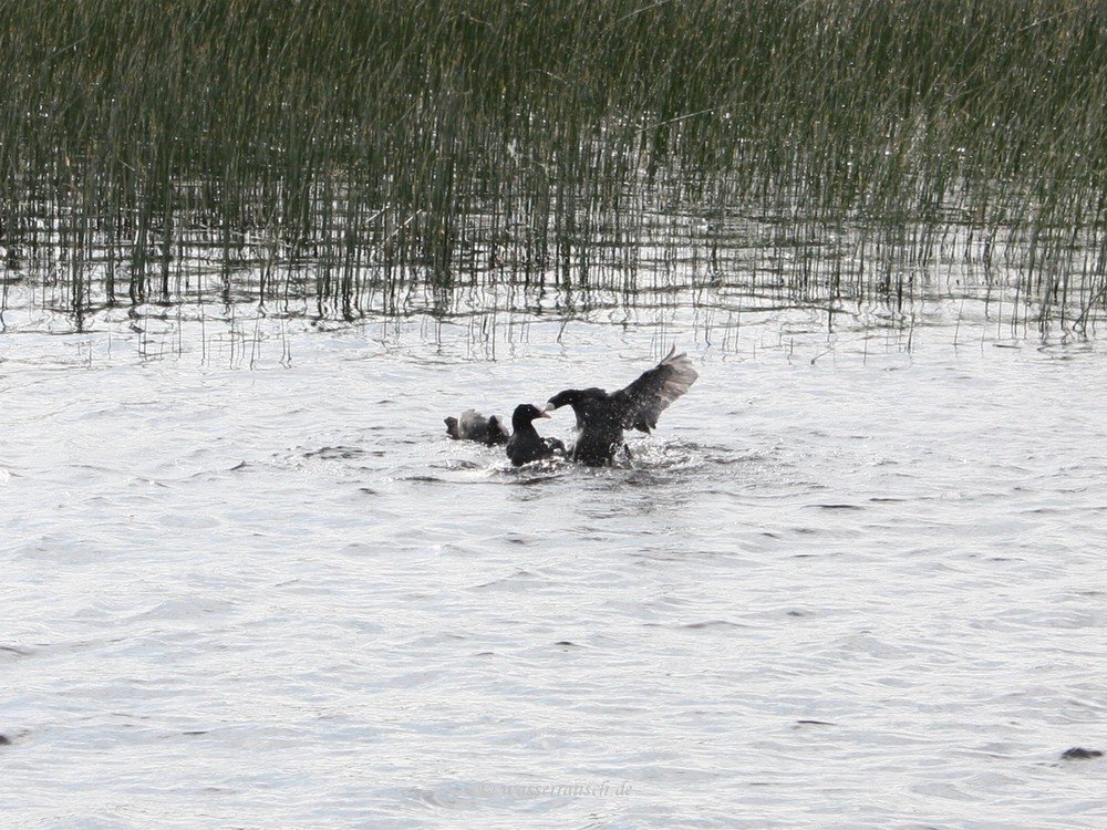 The fight starts between two male Eurasian Coots (Blesshuhn).