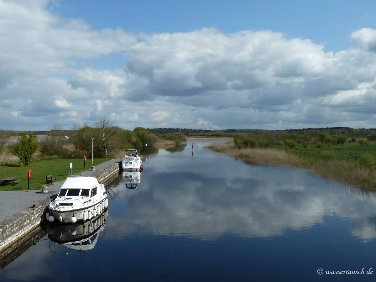 Pat is the whole time shaking his head and helps Willi to remove five fenders from one side. The second trial to drive into the lock is successful. Battlebridge Lock is the narrowest of the three Lough Allen Canal locks. A friendly couple, who were walking along, help us to bring the boat with ropes and a bit engine power out of the lock and we replace one fender for the overnight mooring above the lock. We thank all for their help. Paddy Joe cannot stop shaking his head and asks us if Silverline is now using for their boats fenders of a bigger size than in the past.