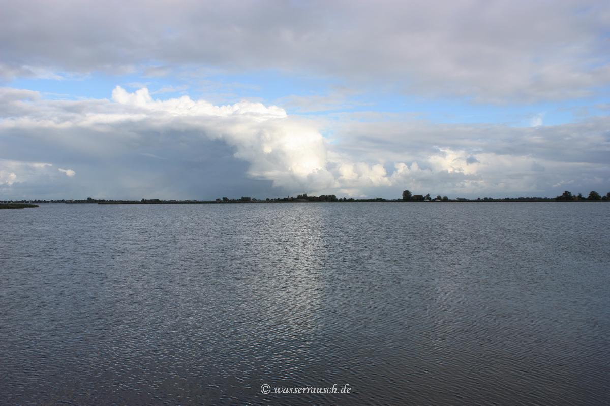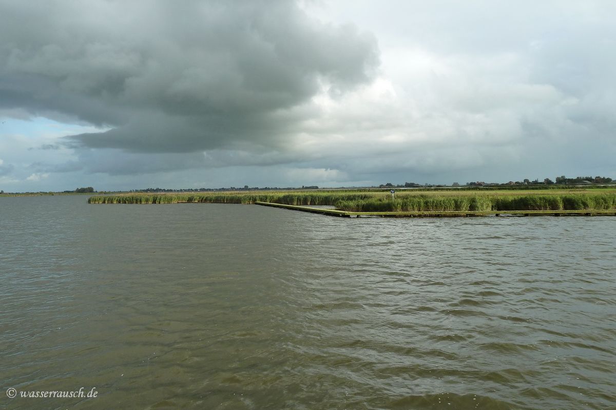 When passing Heeg the wind picks up. Although again real blustery rain sets in I drive outside. A frontal system arrives just at the moment when we have to cross a lake. Hegemer Mar and De Fluezen are in reality not two lakes, they are one large lake with few islands, not very deep but the SW-NE length of open water lets the near gale SW wind produce some waves and so we are riding. At the island Leijepolle we have to turn to NW, that means we get broadsides and are rolling till we reach the lee of the island Langehoekspolle.